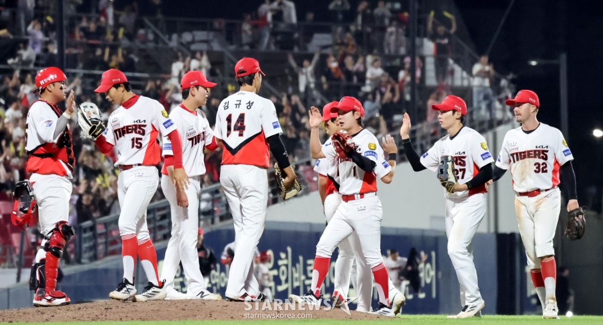 기아 선수들이 16일 광주KIA챔피언스필드에서 열린 2026KBO리그 기아타이거즈와 키움히어로즈의 경기 5-1로 역전승한 후 팬들에게 인사를 하며 자축하고 있다.