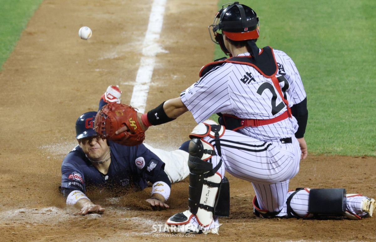 롯데 8회초 1사 1,3루에서 3루주자 한동희가 레이예스의 희생 플라이 때 홈으로 뛰어 세이프되고 있다. 공을 놓치는 LG 포수는 박동원.