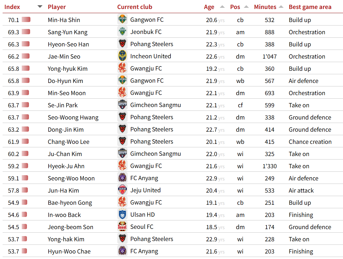 구단별 U23 1위 선수는 강원 신민하, 전북 강상윤, 포항 한현서, 인천 서재민, 광주 김용혁, 김천 박세진, FC안양 문성우(23·전체 14위), 제주 SK 김준하(21·15위), 울산 HD 백인우(20·17위), FC서울 손정범(19·18위)이었다. 그 외 구단 U23 선수들은 CIES 선정 톱20에 오르지 못했다.
