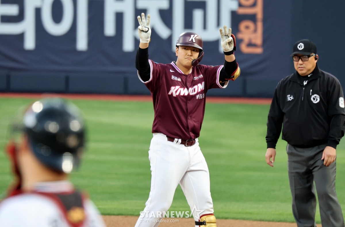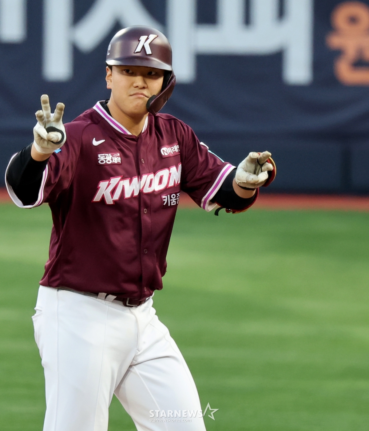 키움 3번타자 김건희가 17일 수원KT위즈파크에서 열린 2026KBO리그 KT위즈와 키움히어로즈의 경기 1회초 1사 2루에서 안타로 출루하고 있다. 2026.04.17.