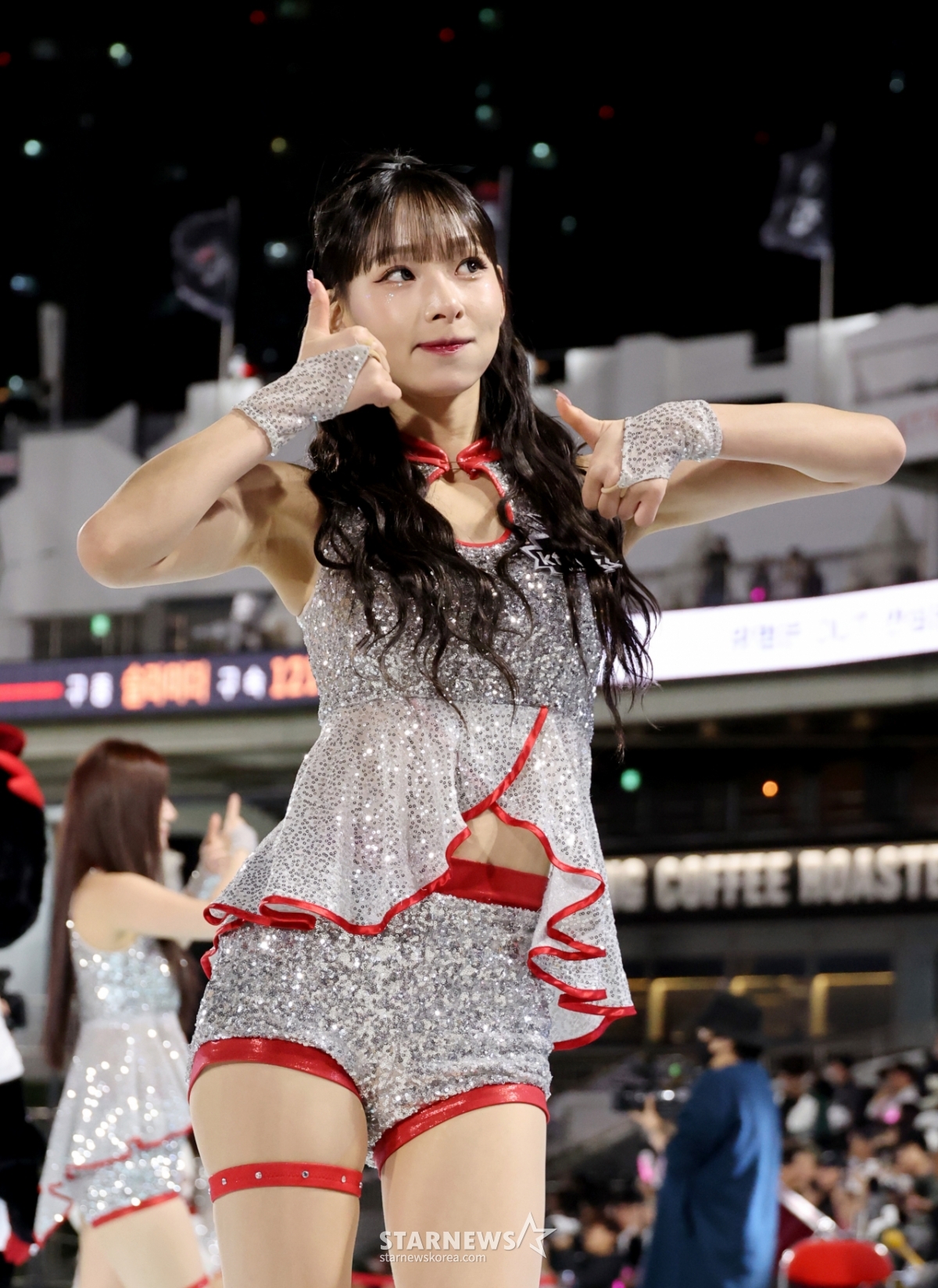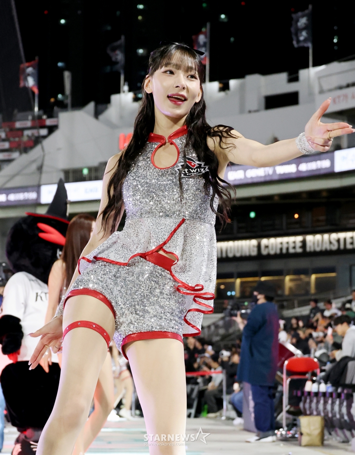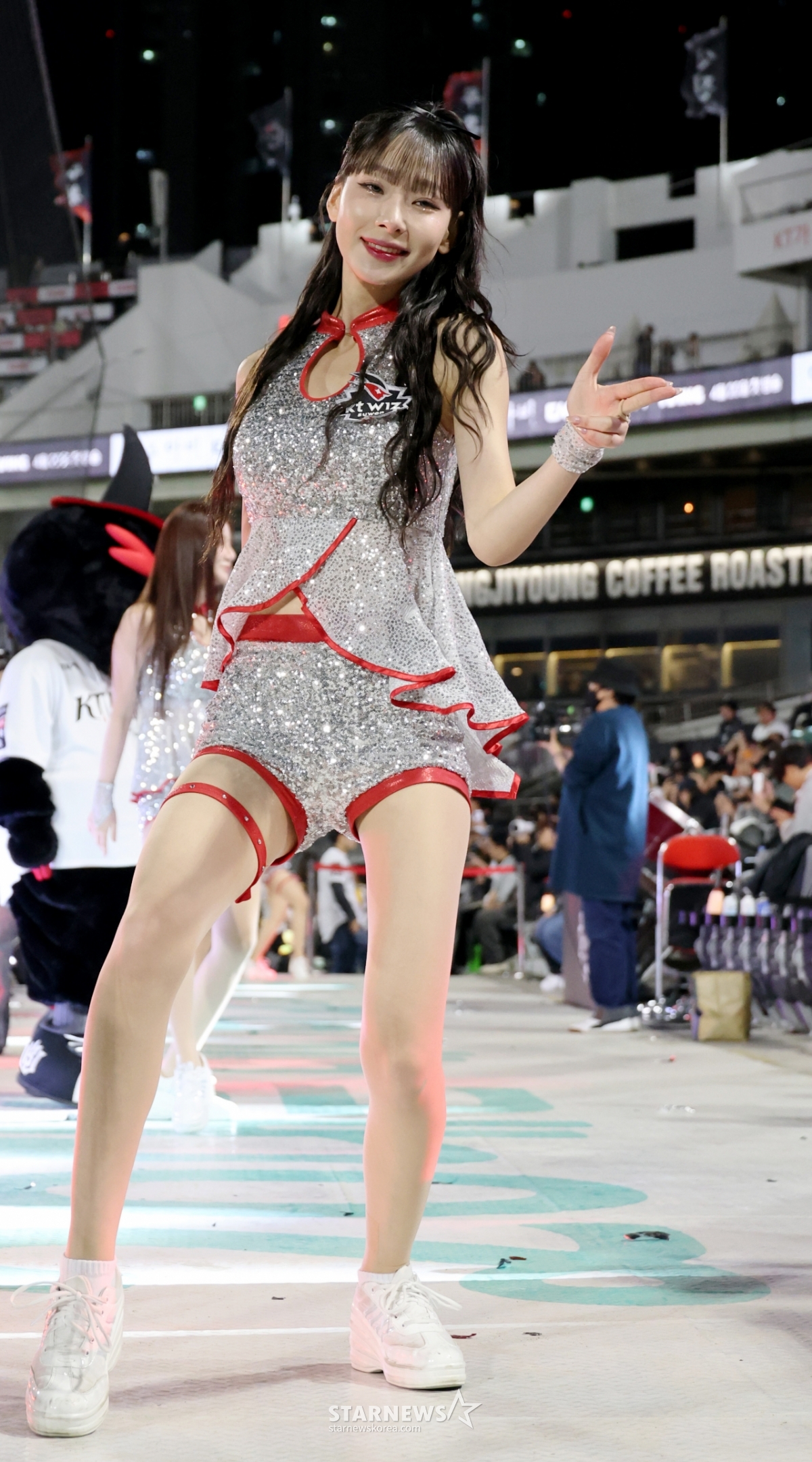 KT 치어리더 정희정이 17일 수원KT위즈파크에서 열린 2026KBO리그 KT위즈와 키움히어로즈의 경기에서 연속으로 아웃송댄스를 선보였다. 정희정 치어리더는 경기 중 팬들에게 즐거움을 선사했다. 이날 경기는 2026KBO리그의 일부로 진행되었다.