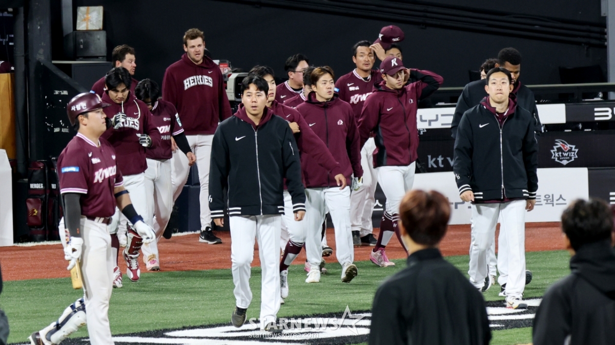 키움 하영민 등 선수들이 17일 수원KT위즈파크에서 열린 2026KBO리그 KT위즈와 키움히어로즈의 경기에서 0-5로 패한 후 그라운드로 나서고 있다. 2026.04.17.