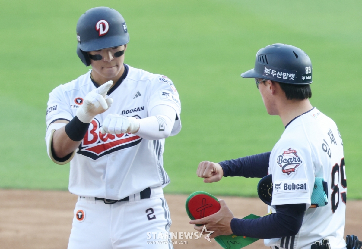 두산 김민석이 3회말 2사 3루에서 1타점 적시타를 날리고 출루한 후 세리머니를 하고 있다.