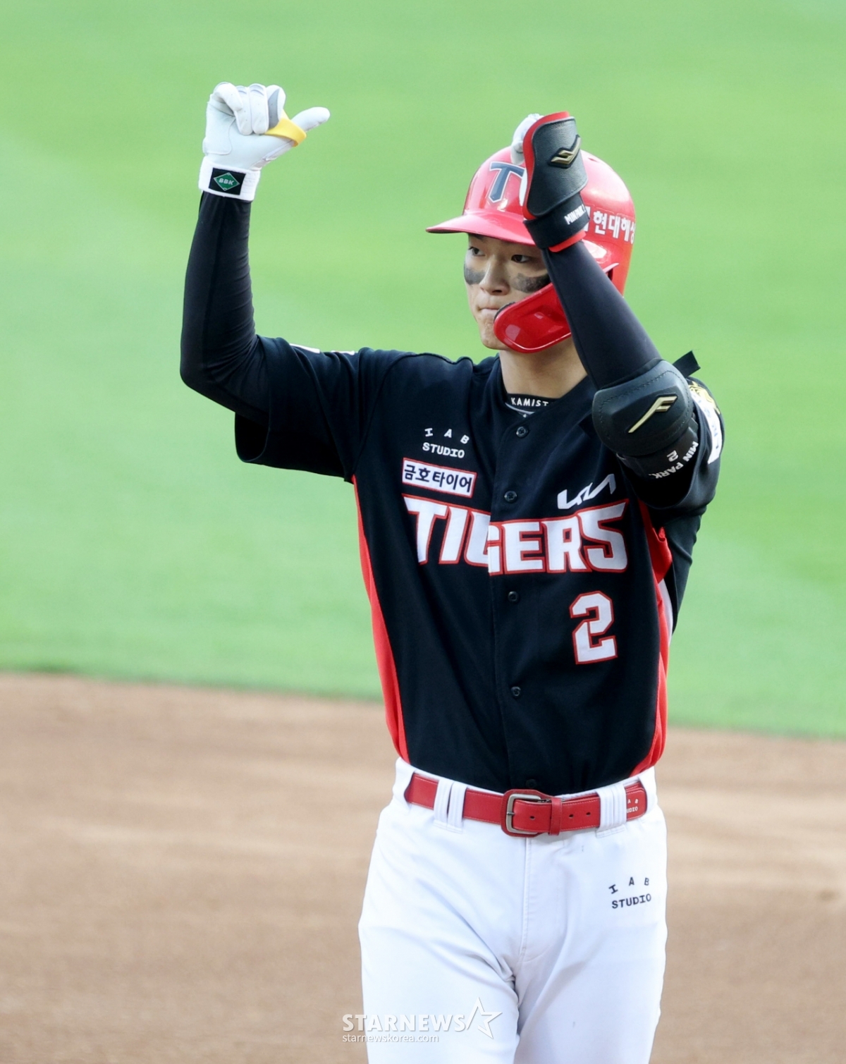 KIA 박민이 5회초 1사 1루에서 중전 안타를 날리고 출루한 후 세리머니를 하고 있다.