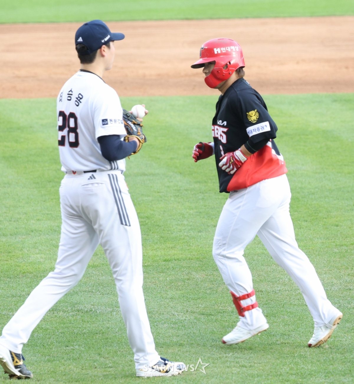 KIA 김선빈이 5회초 1사 1,2루에서 두산 선발 최승용을 상대로 1타점 적시타를 날리고 출루한 후 대주자와 교체되고 있다.
