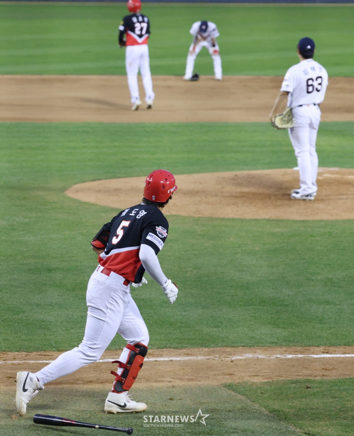 KIA 김도영이 8회초 1사 2루에서 두산 김택연을 상대로 역전 2점 홈런을 날린 후 공의 궤적을 바라보며 다이아몬드를 돌고 있다.
