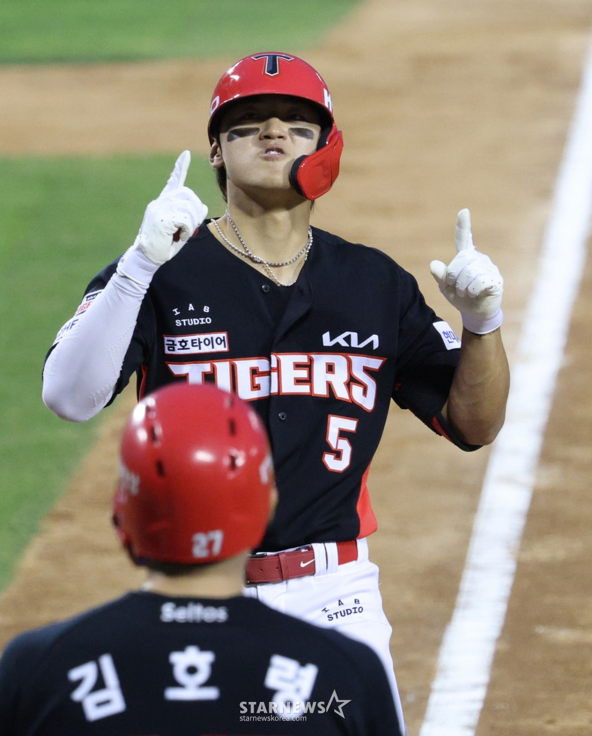 KIA 김도영이 8회초 1사 2루에서 두산 김택연을 상대로 역전 2점 홈런을 날리고 홈인하고 있다.