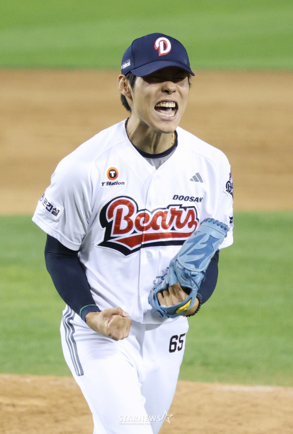 두산 윤태호가 연장 10회초 2사 만루에서 KIA 정현창을 플라이로 잡고 표효하고 있다.
