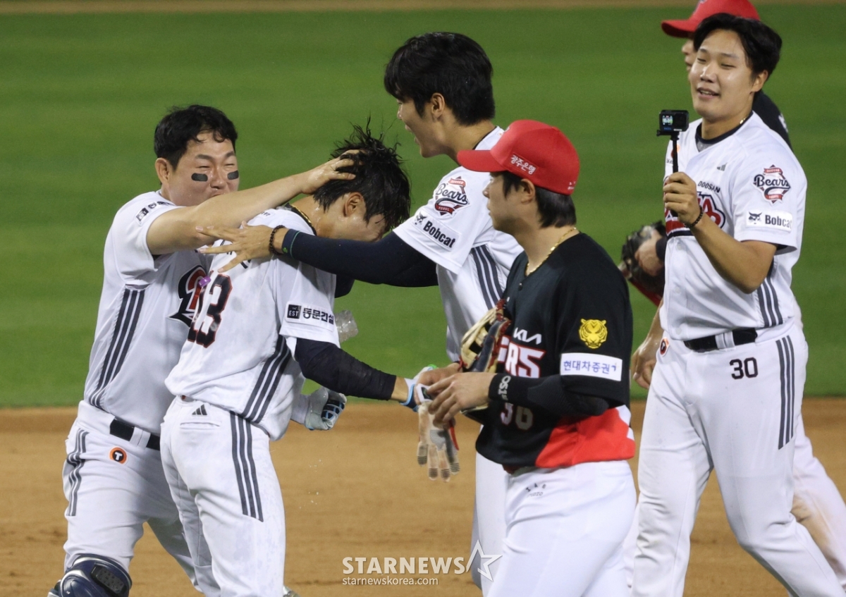 두산 이유찬이 연장 10회말 1사 1,2루에서 끝내기 2루타를 날리고 동료들과 기뻐하고 있다.
