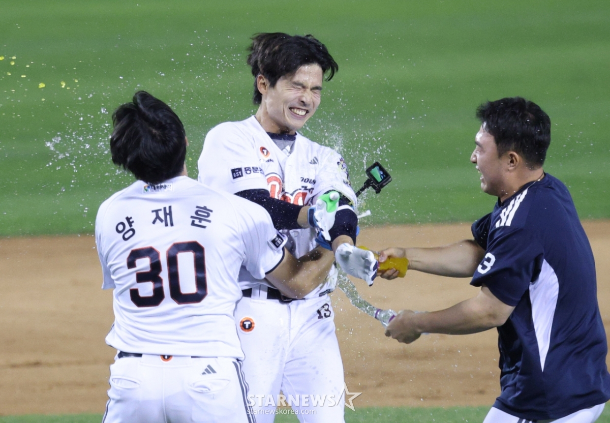 경기 후 거친 물벼락 축하를 받은 이유찬은 "원래 여름에도 뜨거운 물로 샤워할 정도로 찬물을 싫어한다"면서도 "그런데 오늘 찬물을 맞았더니 뜨겁더라"며 환하게 웃었다.