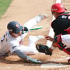 두산 김민석이 5회말 2사 2루에서 1타점 적시 2루타를 날리고 출루한 후 세리머니를 하고 있다.
