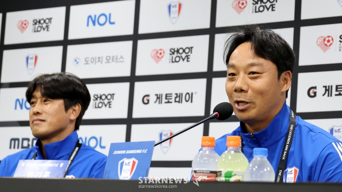 수원삼성 레전드 염기훈이 19일 수원 월드컵경기장에서 열리는OGFC와 수원삼성의 레전드 매치에 앞서 서정원감독과 함께 기자회견에 참석해 소감을 밝히고 있다. 2026.04.19.