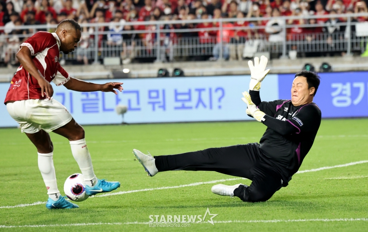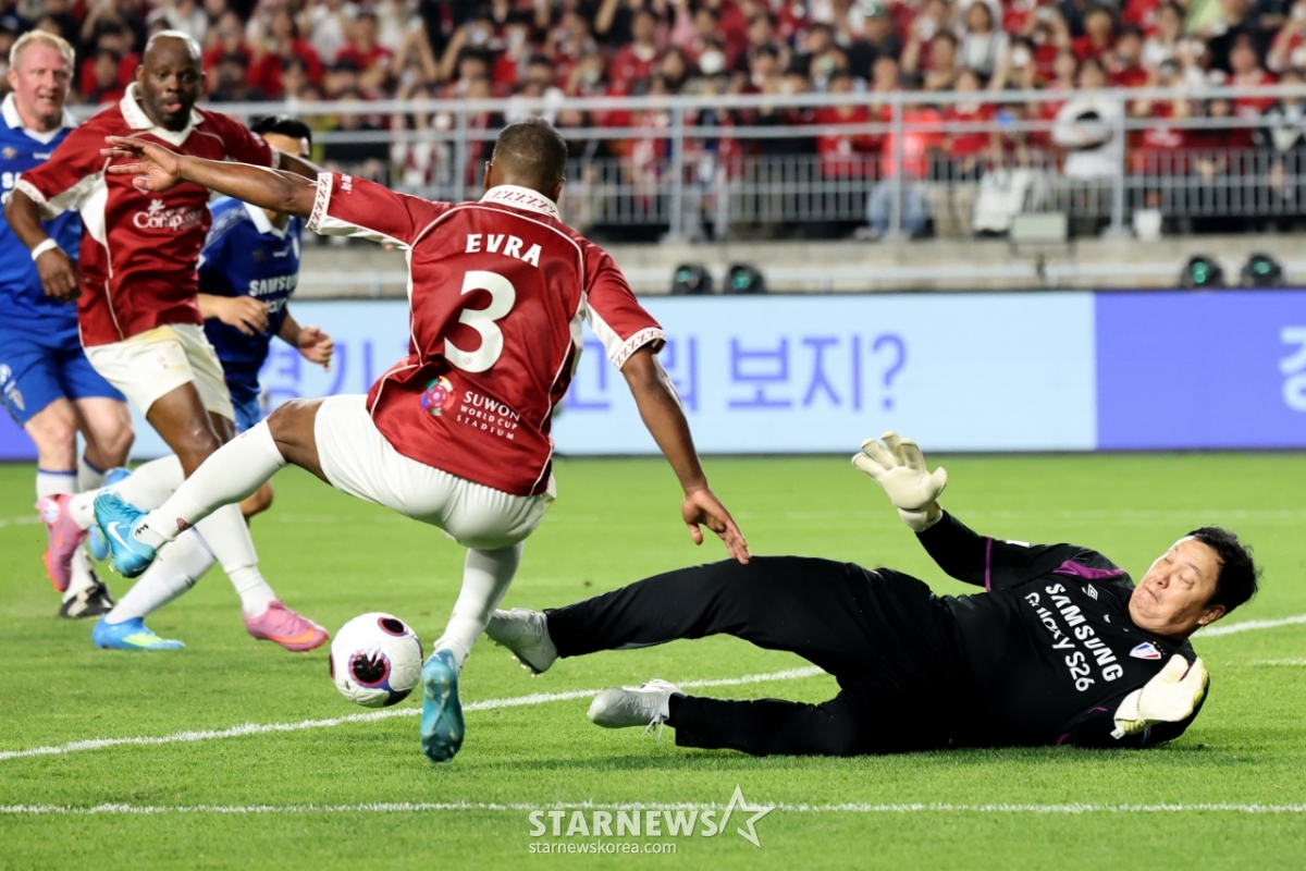 OGFC 에브라가 19일 수원 월드컵경기장에서 열린 OGFC와 수원삼성의 레전드 매치 후반에 이운재의 마크를 받으며 슈팅을 시도했다. 에브라는 슈팅을 놓쳤고, 오프사이드 판정을 받았다. 이운재는 에브라를 막기 위해 노력했다.