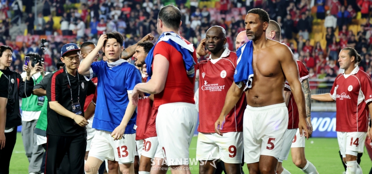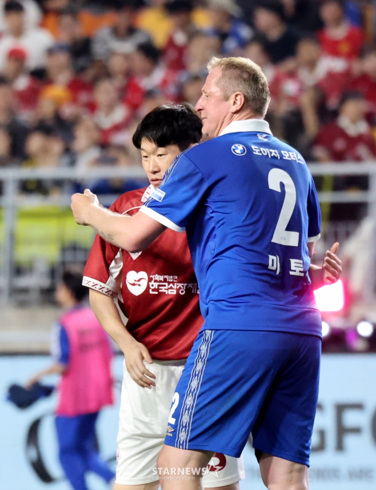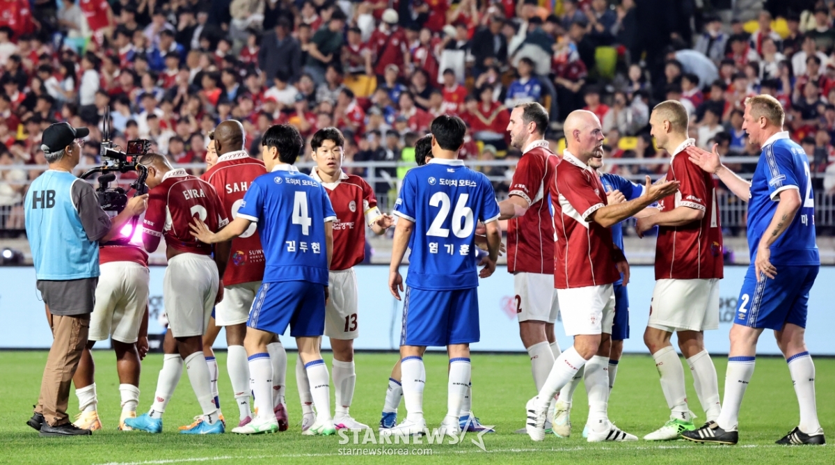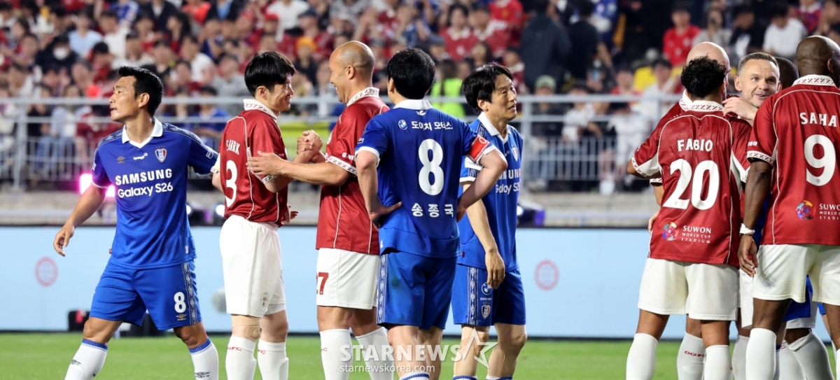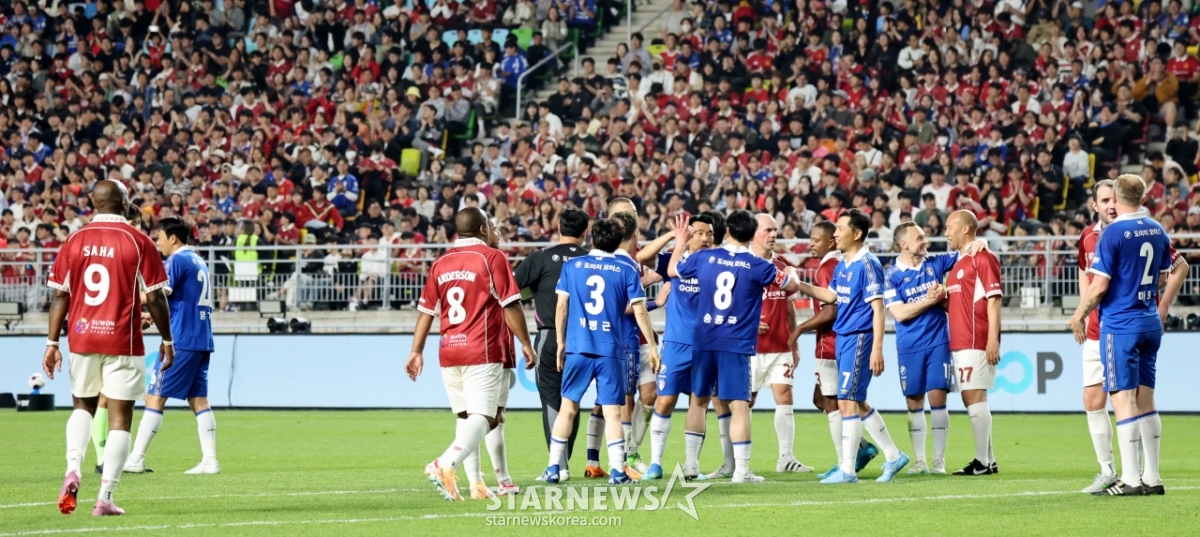 19일 수원 월드컵경기장에서 열린 OGFC와 수원삼성의 레전드 매치에서 수원삼성 레전드 팀이 승리했다. 수원 산토스의 전반 결승골로 수원삼성 레전드 팀이 승리했다. 경기를 마친 양팀 선수들이 그라운드를 돌며 팬들과 인사를 나누며 마무리했다.