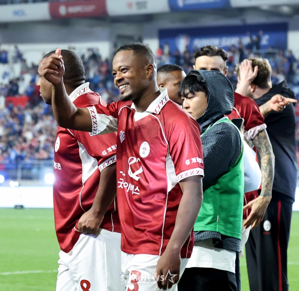 19일 수원 월드컵경기장에서 열리는OGFC와 수원삼성의 레전드 매치에서 수원 산토스의 전발 결승골로 수원삼성 레전드 팀이 승리했다. 경기를 마친 양팀 선수들이 그라운드를 돌며 팬들과 인사를 나누며 마무리하고 있다.. 2026.04.19.