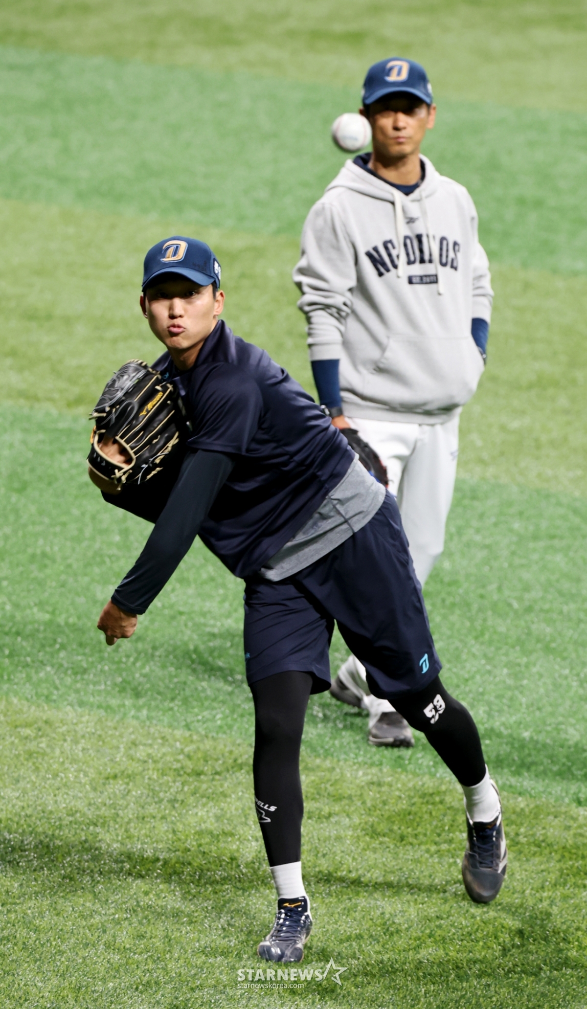 NC 구창모가 21일 고척스카이돔에서 열리는 2026KBO리그 키움히어로즈와 NC다이노스 경기를 앞두고 김경태 코치가 지켜보는 가운데 피칭으로 몸을 풀고 있다. 2026.04.21.