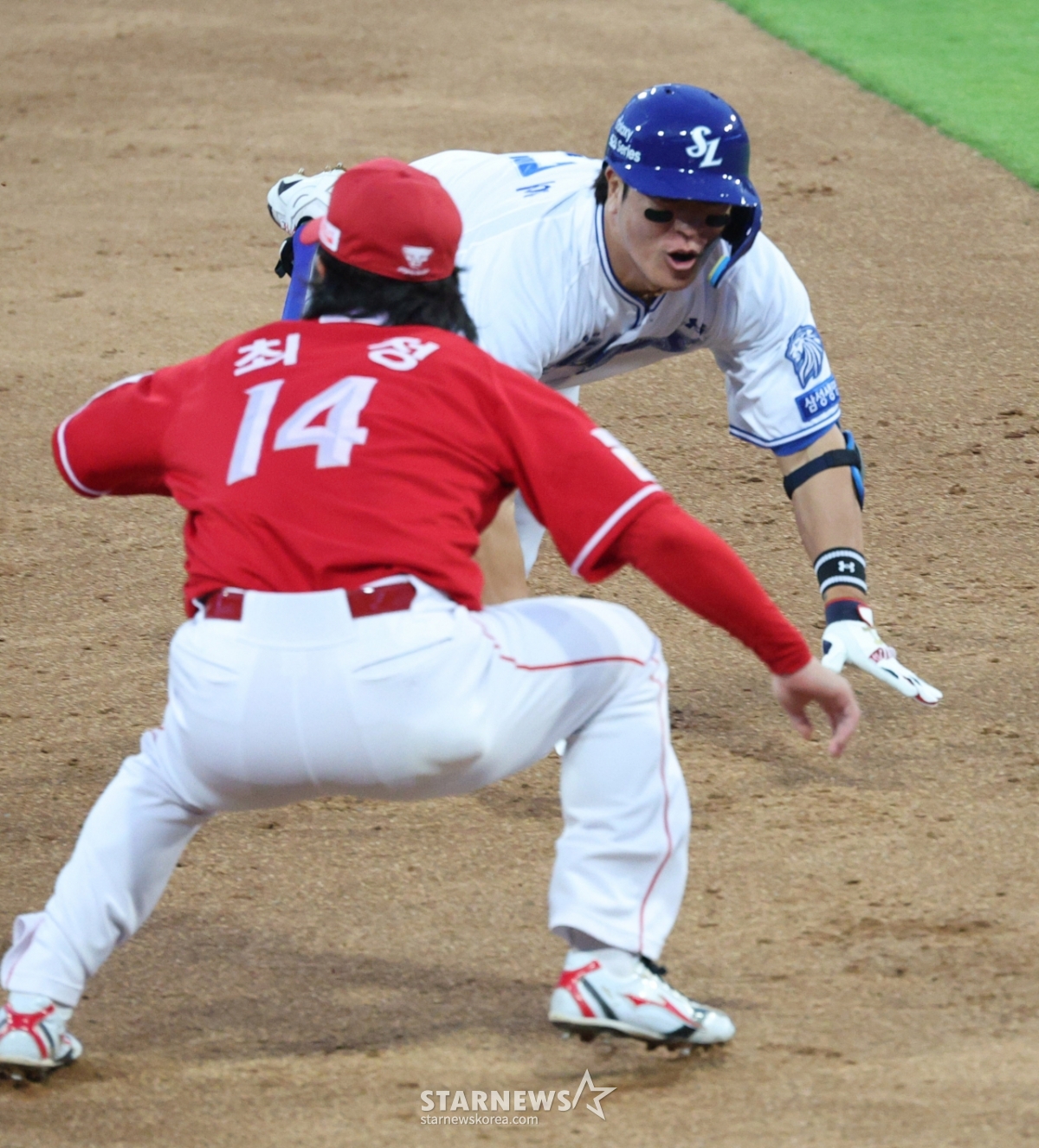 삼성 강민호가 2회말 2사 2루에서 선제 1타점 적시 2루타를 날리고 3루까지 내달렸으나 SSG 3루수 최정에 태그아웃되고 있다.