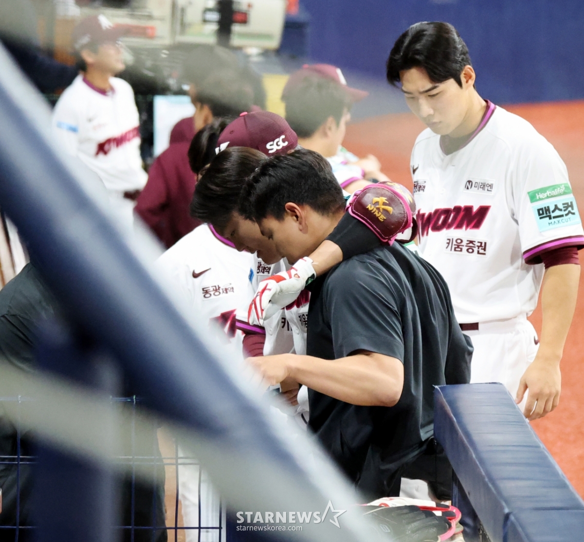 키움 6번타자 박찬혁이 21일 고척스카이돔에서 열리는 2026KBO리그 키움히어로즈와 NC다이노스 경기 2회말 1사후 내야안타로 전력질주하다 부상을 당해 교체되고 있다. 2026.04.21.