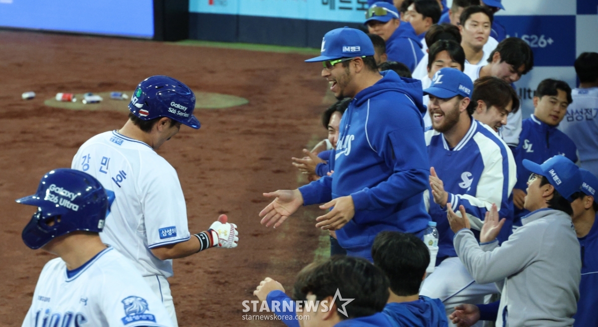 21일 대구 삼성라이온즈파크에서 2026 신한 SOL KBO리그 삼성 라이온즈 대 SSG 랜더스 경기가 열렸다. 삼성 강민호는 2회말 2사 2루에서 선제 1타점 적시 2루타를 날렸다. 강민호는 3루까지 내달렸으나 SSG 3루수 최정에 태그아웃됐고, 동료들의 환영을 받았다.