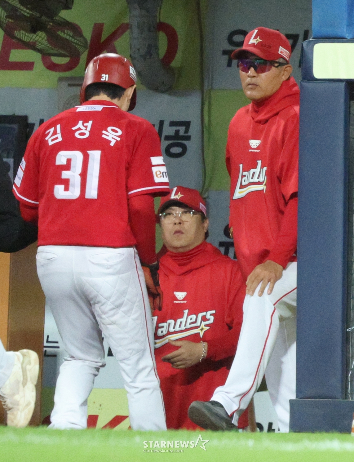 2026 신한 SOL KBO리그 삼성 라이온즈 대 SSG 랜더스 경기가 21일 대구 삼성라이온즈파크에서 열렸다. SSG는 4회초 1사 2,3루 상황에서 3루주자 김성욱이 박성한의 우익수 플라이 때 동점 득점을 했다. 이숭용 감독은 동점 득점을 한 김성욱을 환영했다.