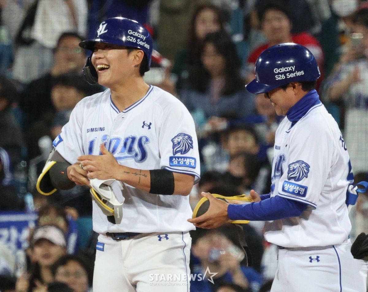 2026 신한 SOL KBO리그 삼성 라이온즈 대 SSG 랜더스 경기가 21일 대구 삼성라이온즈파크에서 열렸다. 삼성 류지혁은 5회말 1사 1,2루 상황에서 역전 적시타를 날렸다. 류지혁은 출루 후 활짝 웃었다.
