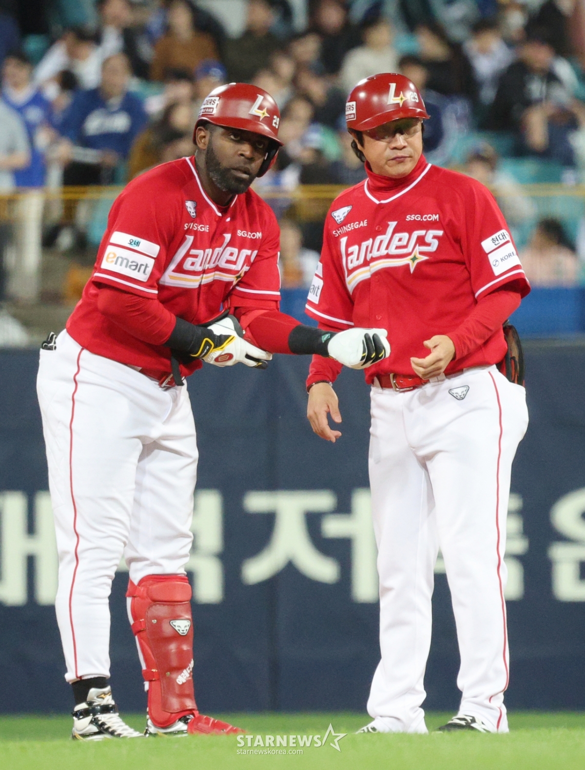 SSG 에레디아가 7회초 2사 2루에서 동점 1타점 적시 2루타를 날리고 출루한 후 윤재국 코치의 환영을 받고 있다.