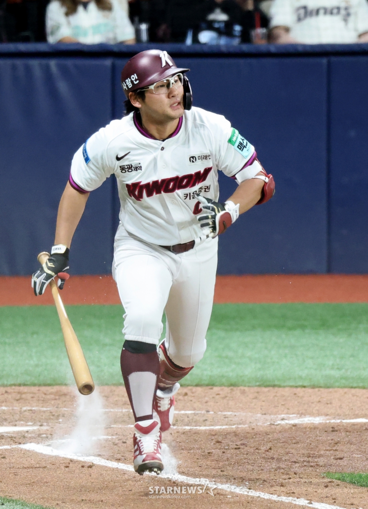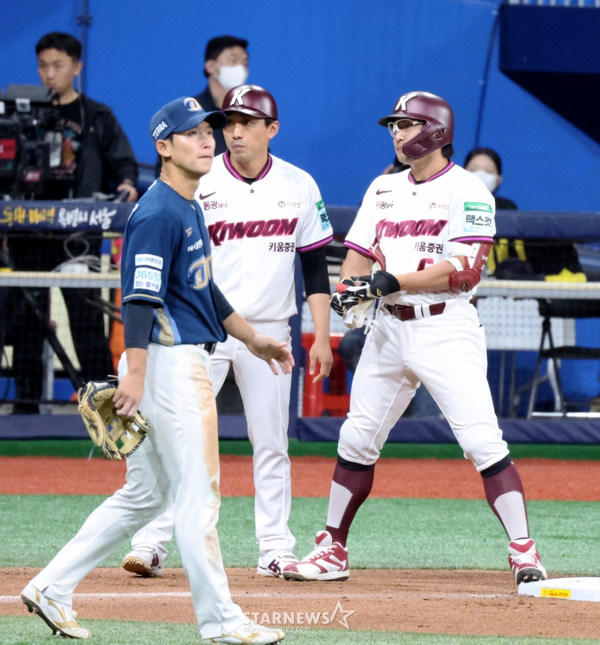 키움 2번타자 임지열이 21일 고척스카이돔에서 열리는 2026KBO리그 키움히어로즈와 NC다이노스 경기 7회말 1사 1루에서 1타점 2루타치고 볼 홈으로 송구되는 사이 3루에 안착하고 있다. 2026.04.21.