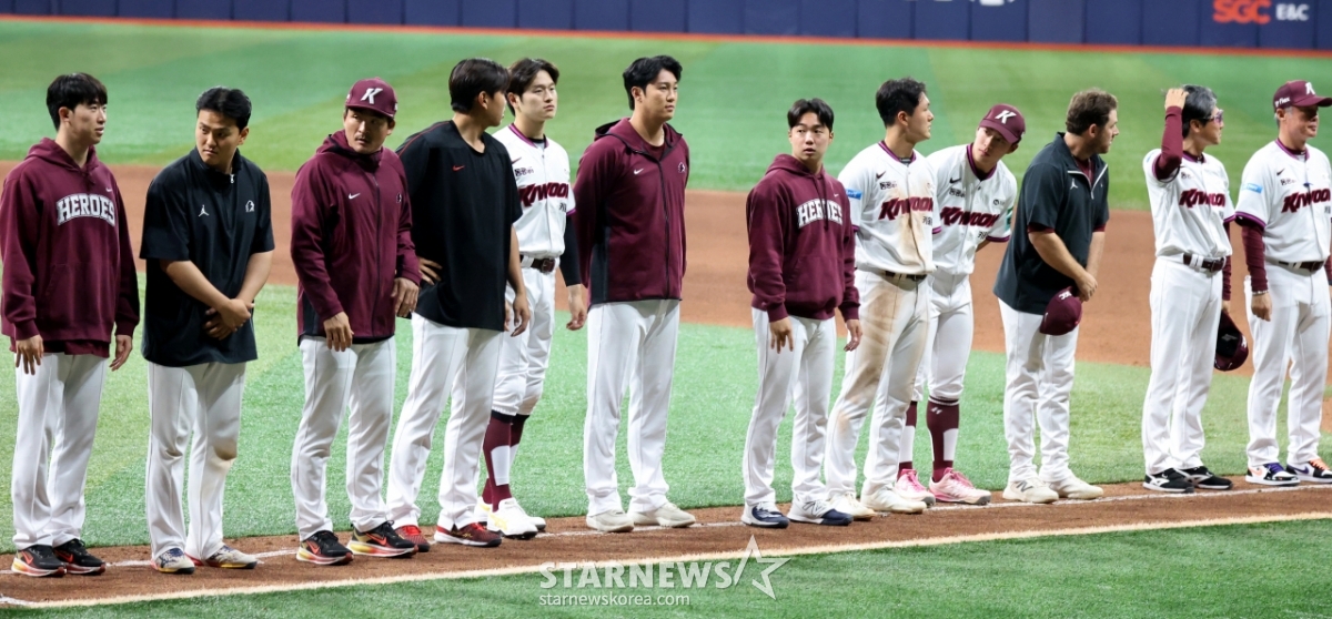 키움 설종진 감독, 안우진 등 선수들이 21일 고척스카이돔에서 열리는 2026KBO리그 키움히어로즈와 NC다이노스 경기에서 2-1로 승리한 후 팬들에 인사하며 퇴장하고 있다. 2026.04.21.