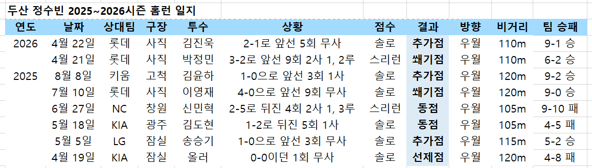 이번 롯데 자이언츠와 부산 사직 방문 경기도 그랬다. 주중 첫 경기인 21일 정수빈은 팀이 3-2로 박빙의 리드를 지키던 9회초 2사 1, 2루에서 박성민을 상대로 깜짝 스리런포를 터뜨렸다. 스코어를 4점 차로 벌려 두산 마무리 김택연도 9회말을 편안하게 막을 수 있었다.