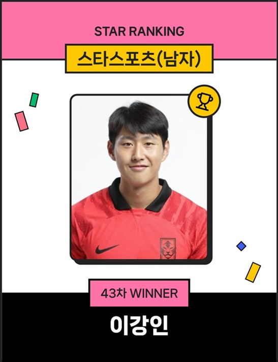 이강인은 지난 16일 오후 3시 1분부터 23일 오후 3시까지 집계된 스타랭킹 스타스포츠 남자 43차 투표에서 1만 4604표를 얻어 김도영(23·KIA 타이거즈)을 제치고 1위를 차지했다.