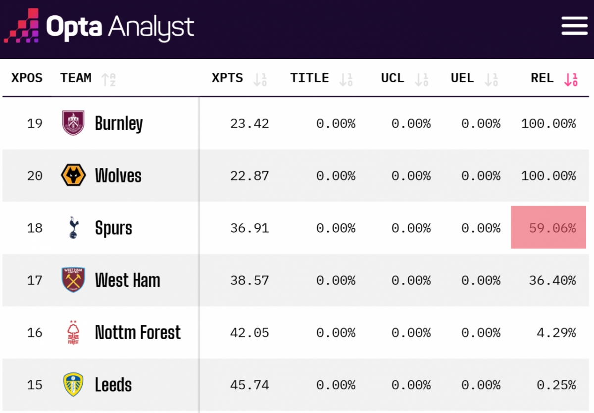 강등 가능성이 남은 팀들 가운데 가장 확률이 높게 예측된 팀이 바로 토트넘이다. 옵타는 토트넘의 강등 확률을 무려 59.06%로 내다봤다. 토트넘은 승점 31(7승10무16패)로 강등권인 18위에 처져 있다. 잔류 마지노선인 17위 웨스트햄 유나이티드(승점 33)와 격차는 2점에 불과해 한 라운드 결과만으로도 순위 역전이 가능하지만, 토트넘은 웨스트햄(36.4%)보다 훨씬 높은 강등 확률을 받았다.