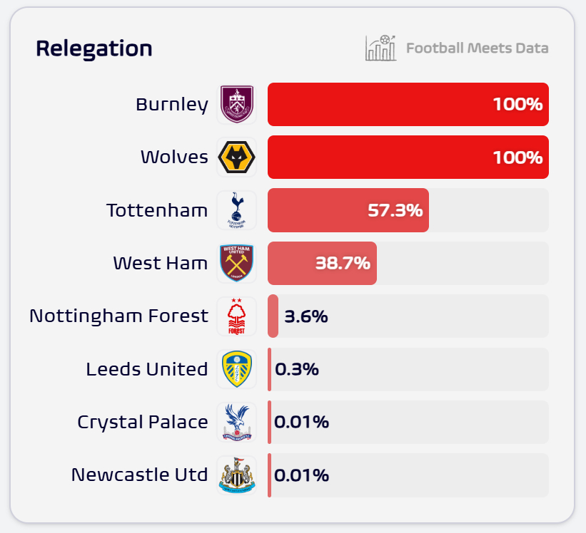 옵타뿐만이 아니다. 또 다른 통계 매체인 풋볼 미츠 데이터도 토트넘의 강등 확률을 50%가 훌쩍 넘는 57.3%로, 웨스트햄은 38.7%로 각각 예측했다. 노팅엄은 3.6%, 리즈는 0.3%, 크리스털 팰리스와 뉴캐슬 유나이티드는 0.01%였다.