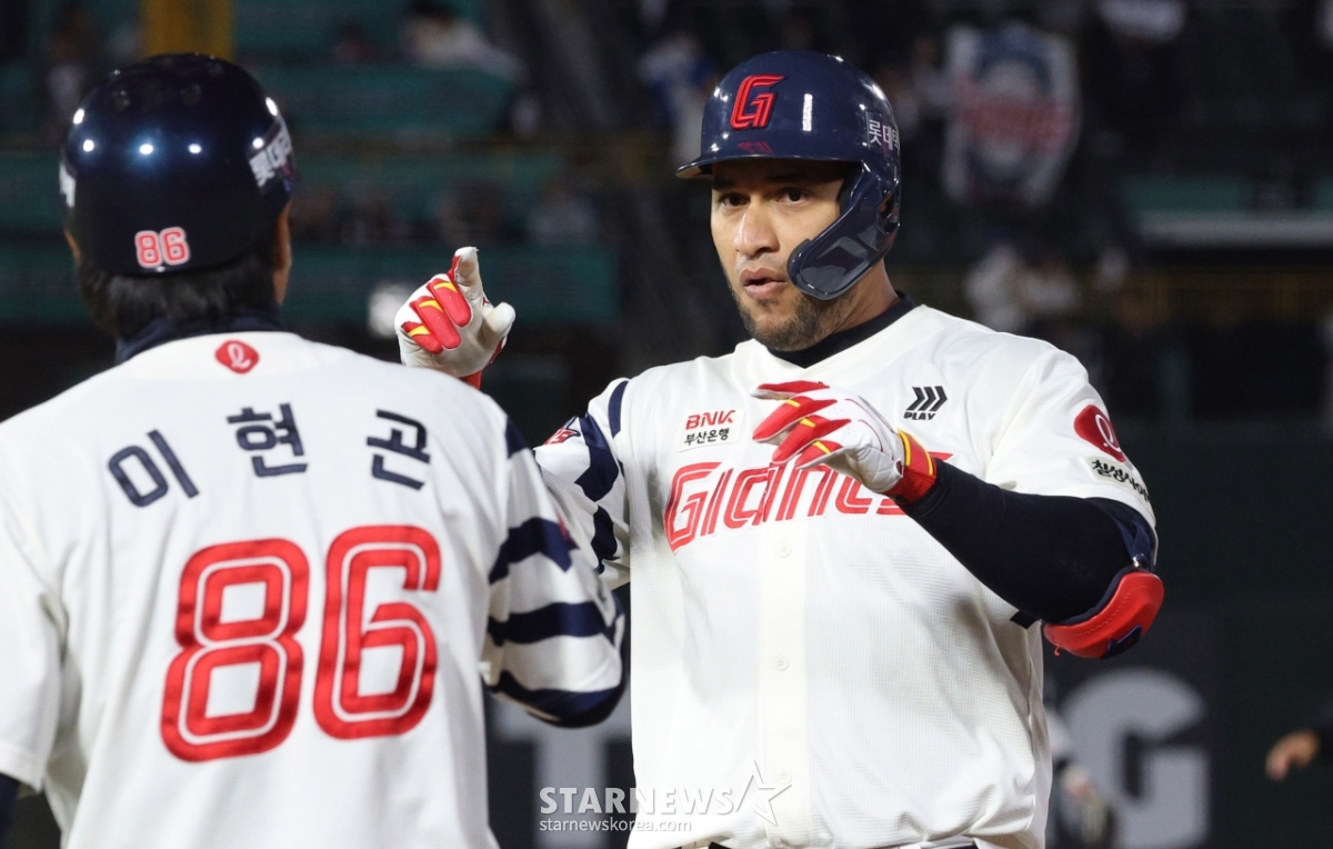 롯데 레이예스가 4회말 2사 2루에서 1타점 적시타를 날리고 출루한 후 세리머니를 하고 있다.