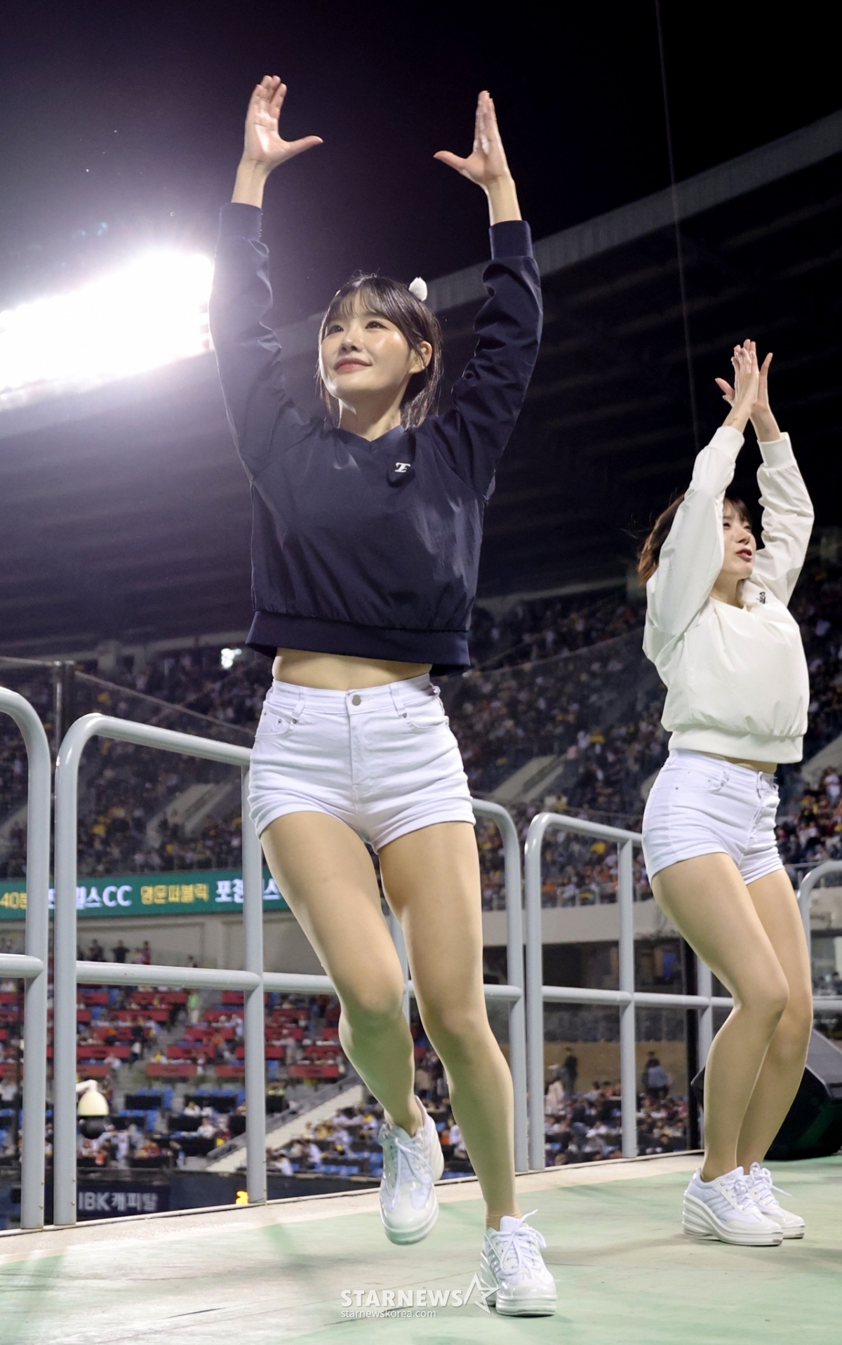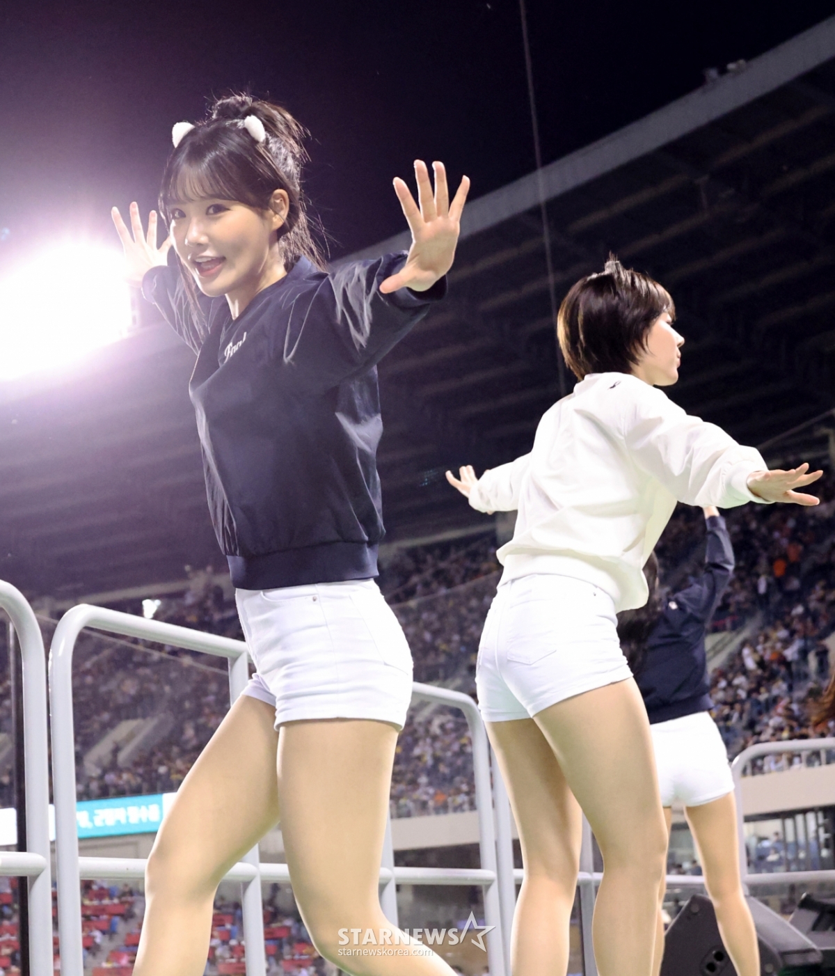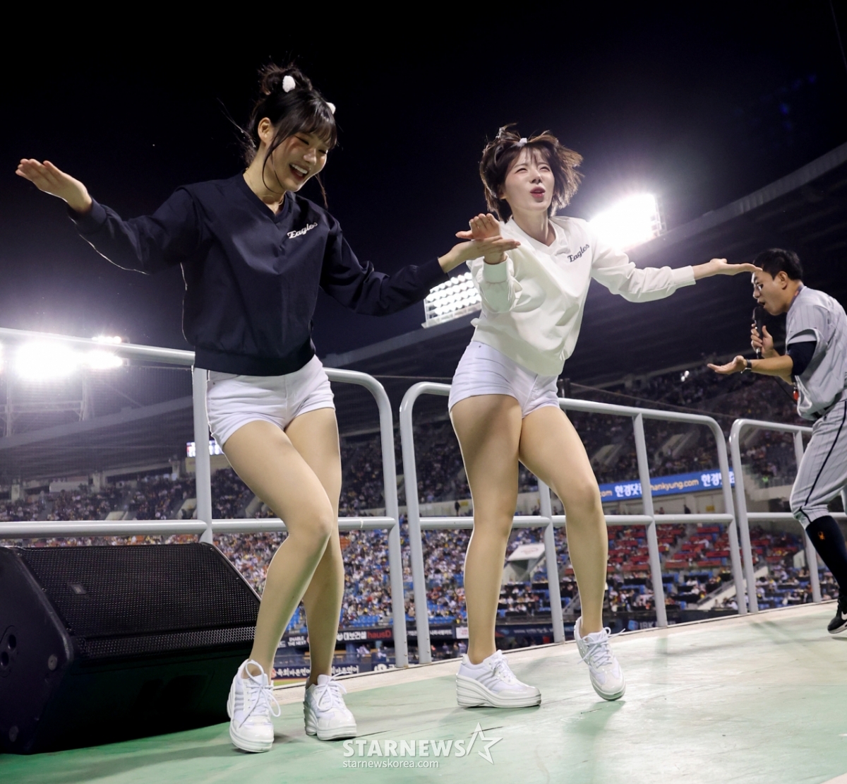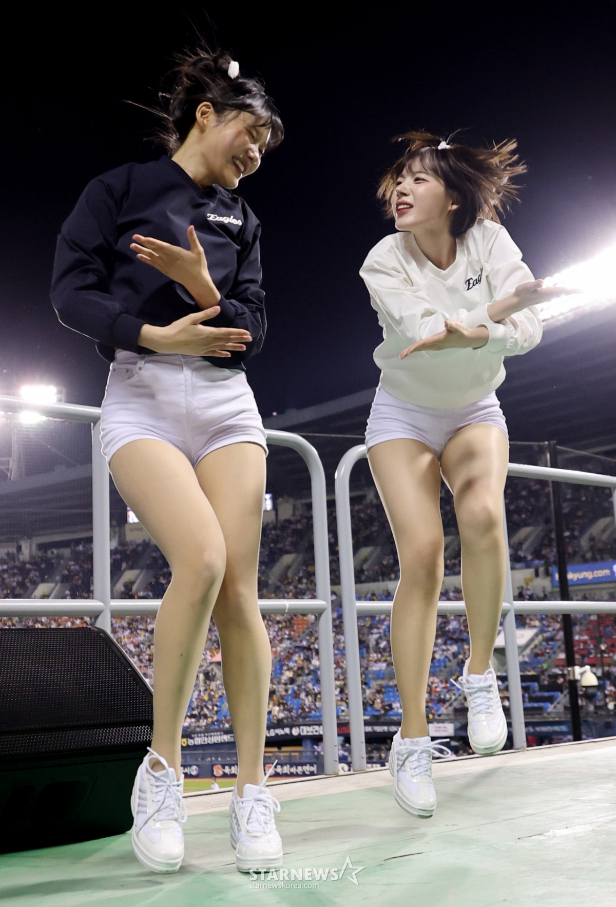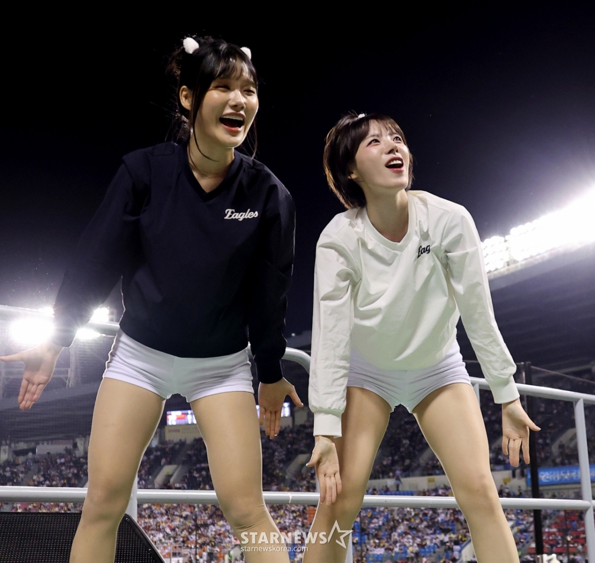 롯데에서 한화로 응원팀을 옮긴 치어리더 최홍라가 23일 잠실야구장에서 열힌 2026 KBO리그 LG트윈스와 한화이글스 경기에서 하지원과 열띤 무대를 펼치고 있다. 2026.04.23.