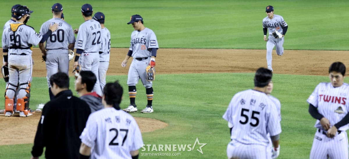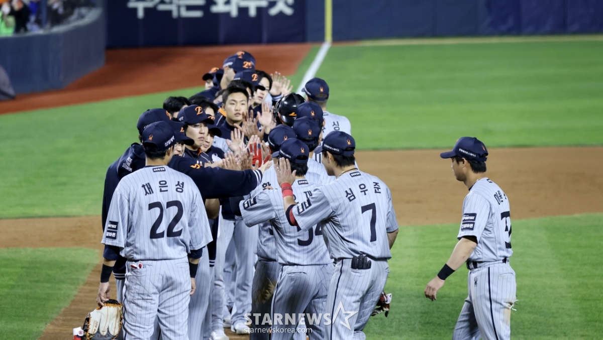 한화 캡틴 채은성과 선수들이 23일 잠실야구장에서 열린 2026 KBO리그 LG트윈스와 한화이글스 경기에서 승리하며 2연패를 탈출한 후 자축하고 있다.