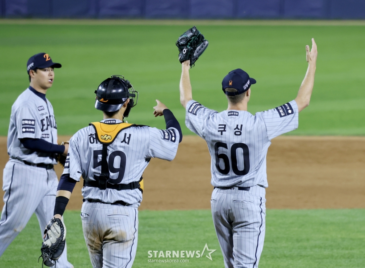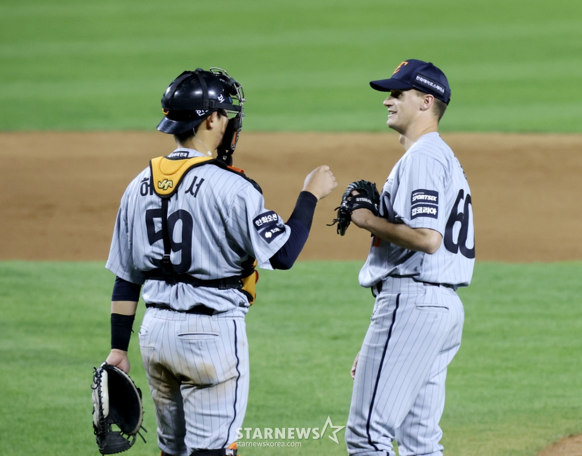 허인서와 첫세이브를 자축하는 쿠싱. 쿠싱은 김서현을 대체하며 마무리로 등판했다.