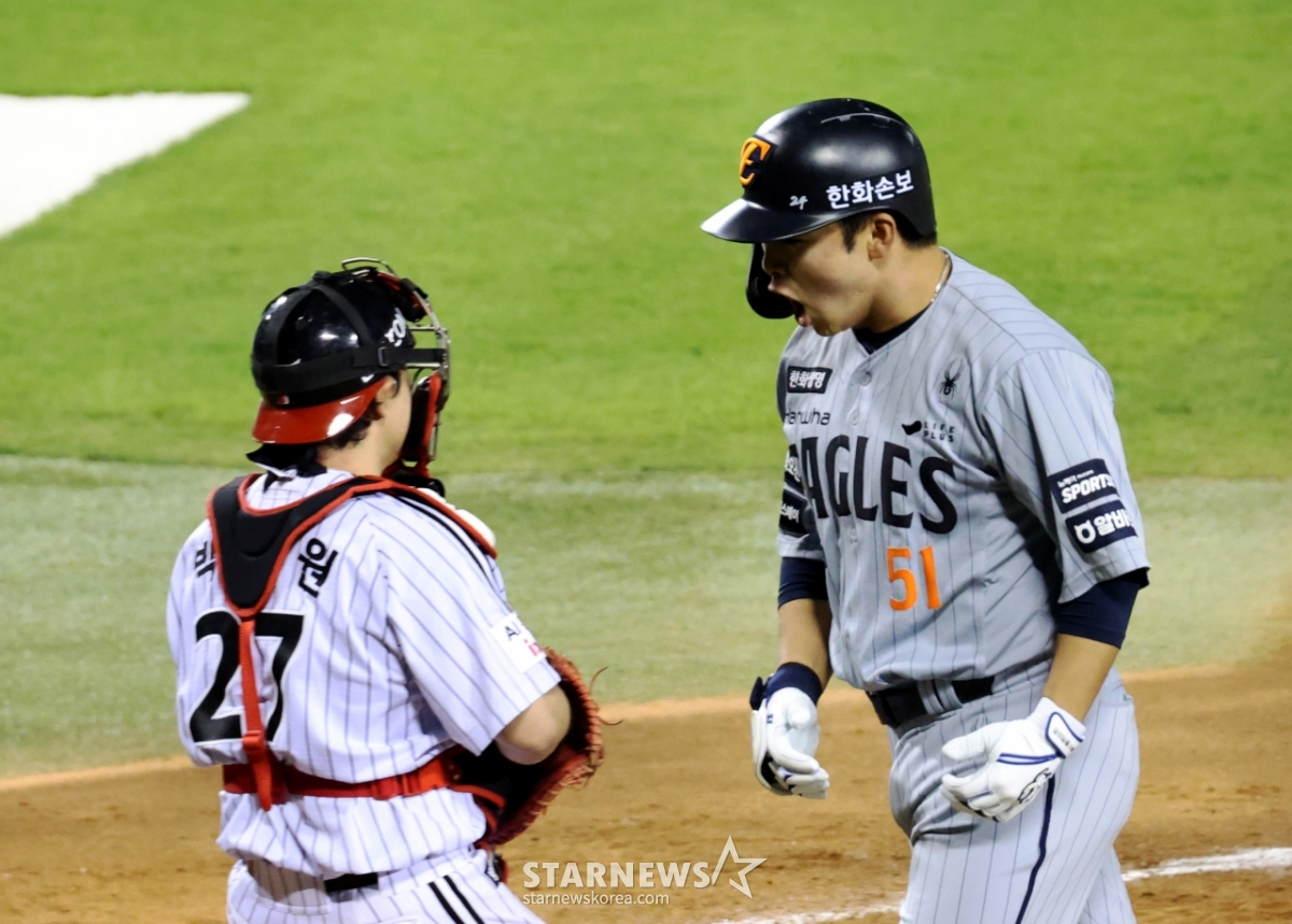 한화 3번타자 문현빈이 23일 잠실야구장에서 열힌 2026 KBO리그 LG트윈스와 한화이글스 경기 5회초 우월 솔로홈런을 터트린 후 홈인하고 있다. 4-2로 리드하는 한화. 2026.04.23.