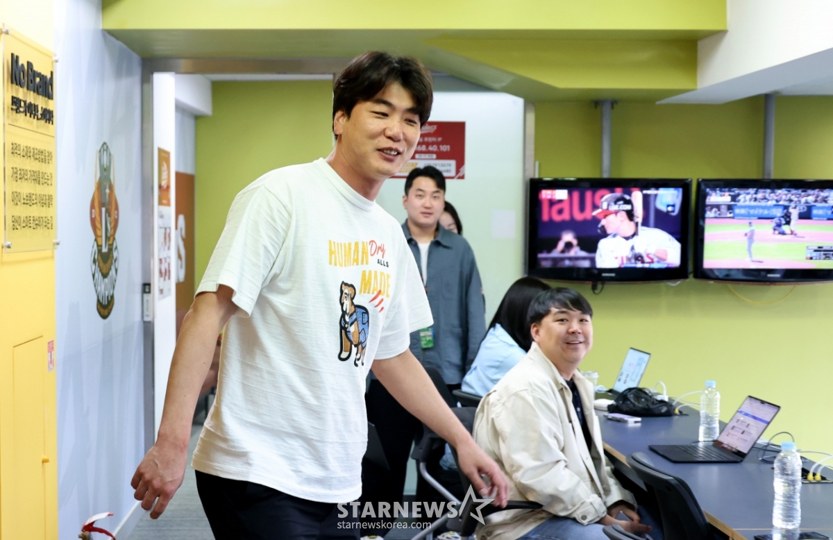 어깨에 웃자란 뼈를 잘라내며 재활이 진행중인 김광현이 24일 열리는 2026KBO리그 SSG랜더스와 KT위즈 경기에 앞서 기자실을 찾아 수술 경과 등 몸상태에 대하여 기자들과 이야기를 나누고 있다. 2026.04.24.