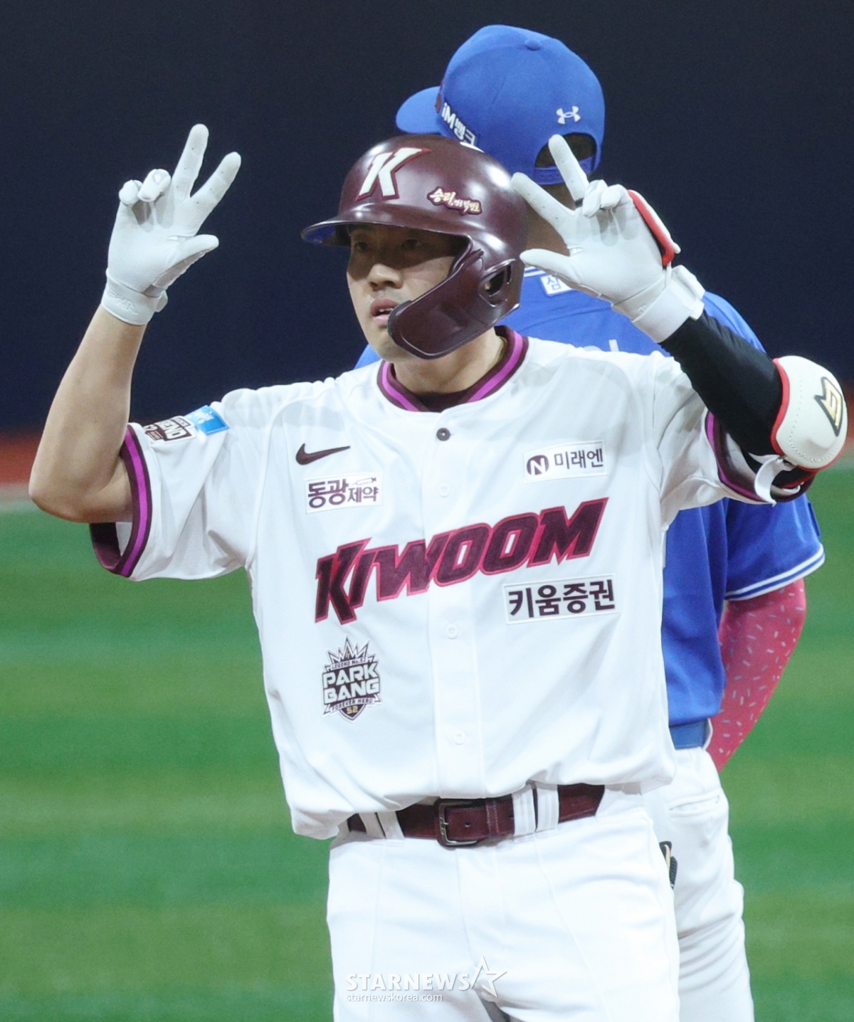 키움 오선진 3회말 1사 2루에서 선제 1타점 적시 2루타를 날리고 출루한 후 세리머니를 하고 있다.