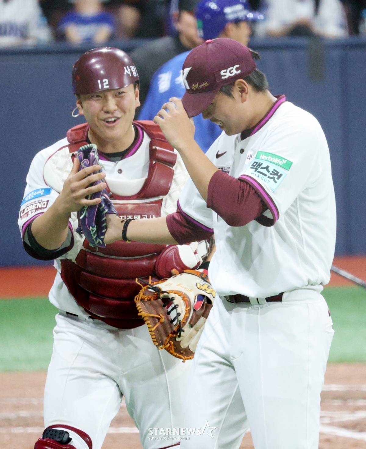 키움 박정훈이 8회초 실점 위기를 넘기며 이닝을 마무리한 후 포수 김건희와 기뻐하며 더그아웃으로 향하고 있다.