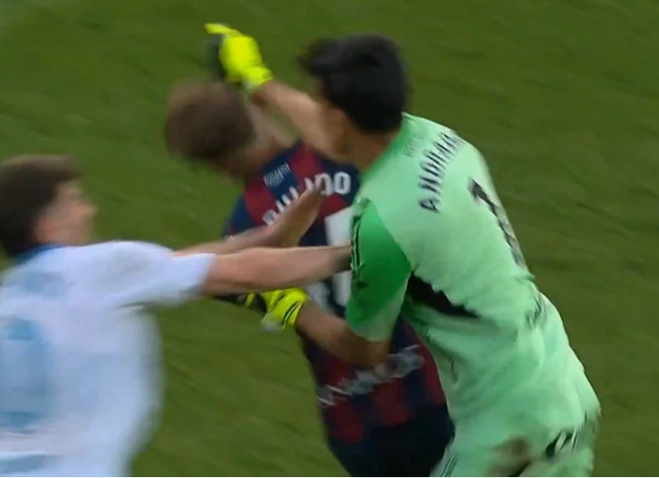 스페인 프로축구 2부리그(세군다 디비시온)에서 골키퍼가 퇴장을 당한 뒤 상대 선수의 얼굴을 주먹으로 가격하는 초유의 사태가 발생했다.