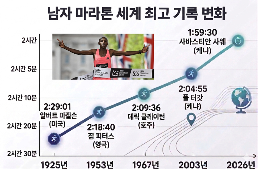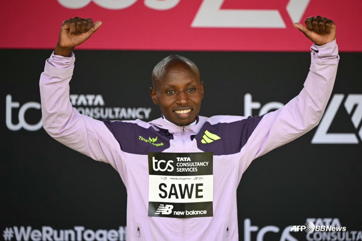 사웨는 26일(현지시간) 영국 런던에서 열린 2026 런던 마라톤 남자부 경기에서 42.195㎞ 풀코스를 1시간 59분 30초에 달려 우승을 차지했다. 켈빈 키프텀(케냐)이 2023년 세운 2시간 00분 35초의 종전 세계 최고 기록을 1분 5초 앞당겼다.