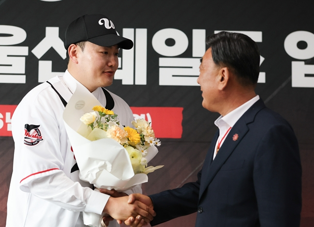 KBO 리그 역사상 최초의 시민구단으로 퓨처스리그에 나서고 있는 '울산 웨일즈'가 메이저리그(MLB) 8시즌 통산 67개의 홈런을 기록한 메이저리그 출신 '거포' 최지만(35)을 품었다. 27일 열린 최지만의 입단식에는 김두겸(68) 울산시장이 직접 참석해 환영의 메시지를 전하며 뜨거운 기대감을 드러냈다.
