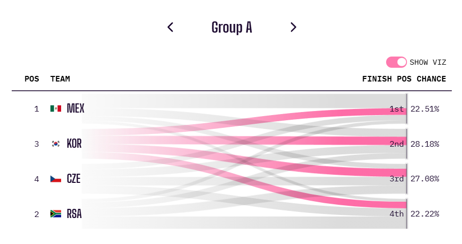 실제 멕시코의 경우 조 1위 확률이 48.13%에 달했고, 2위는 26.44%, 3위는 16.16%, 최하위인 4위는 9.28%에 그쳤다. 체코는 조 3위 확률이 28.5%로 가장 높았고 4위 27.36%, 2위 26.04%, 1위 18.09% 순이었다. 최약체로 꼽히는 남아프리카공화국은 4위 확률이 41.13%로 가장 높았고, 3위 28.26%, 2위 19.34%, 1위 11.27% 순이었다.
