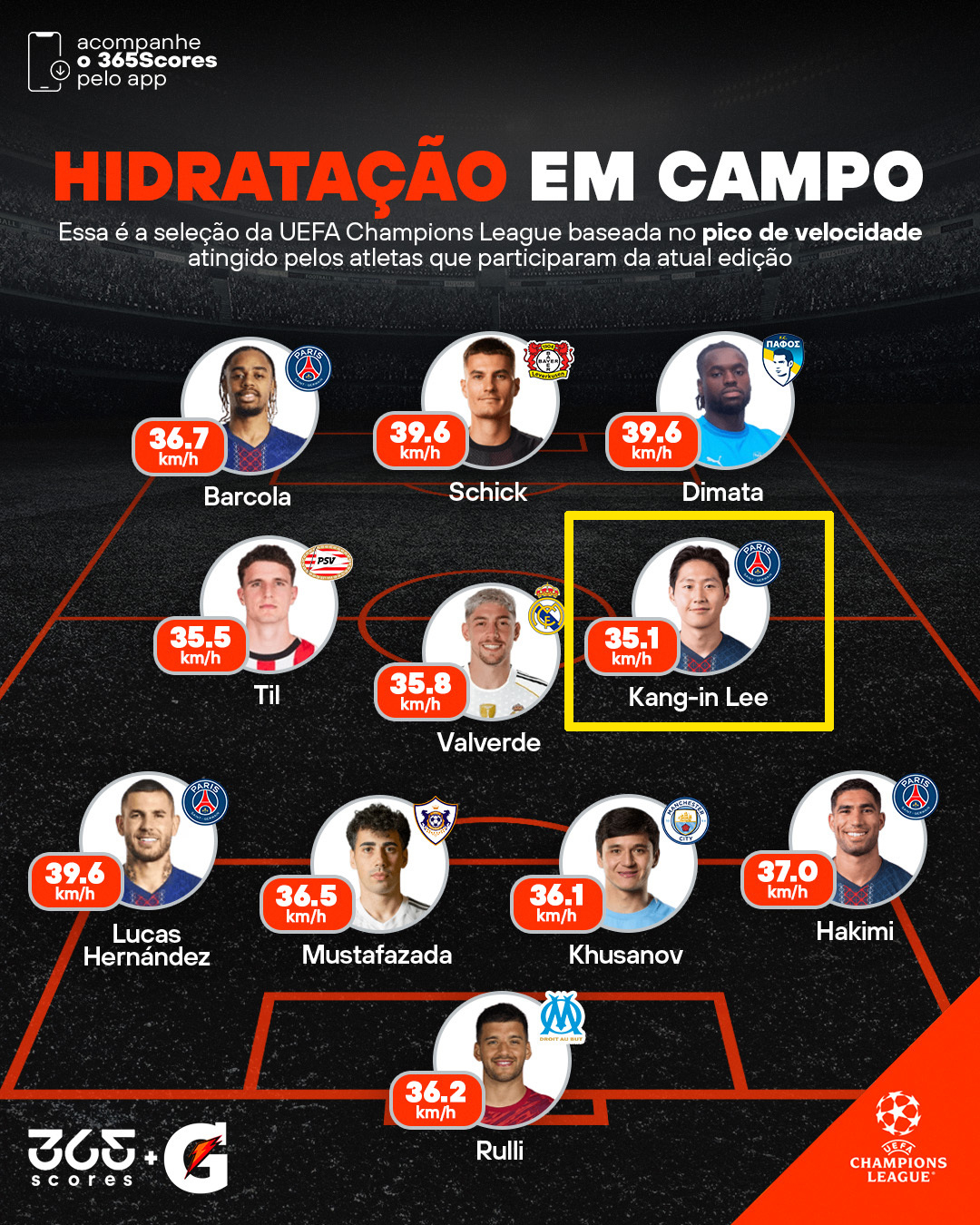 이어 이강인의 소속팀 동료인 풀백 아슈라프 하키미가 37㎞/h, 브래들리 바르콜라가 36.7㎞/h를 각각 기록했다. 그 뒤를 센터백 바흐룰 무스타파자다(카라바흐·36.5㎞/h), 골키퍼 헤로니모 룰리(마르세유·36.2㎞/h), 센터백 압두코디르 후사노프(맨체스터 시티·36.1㎞/h), 그리고 이강인을 포함한 3명의 미드필더가 그 뒤를 이었다.