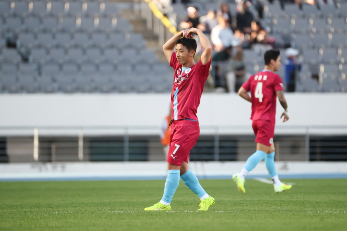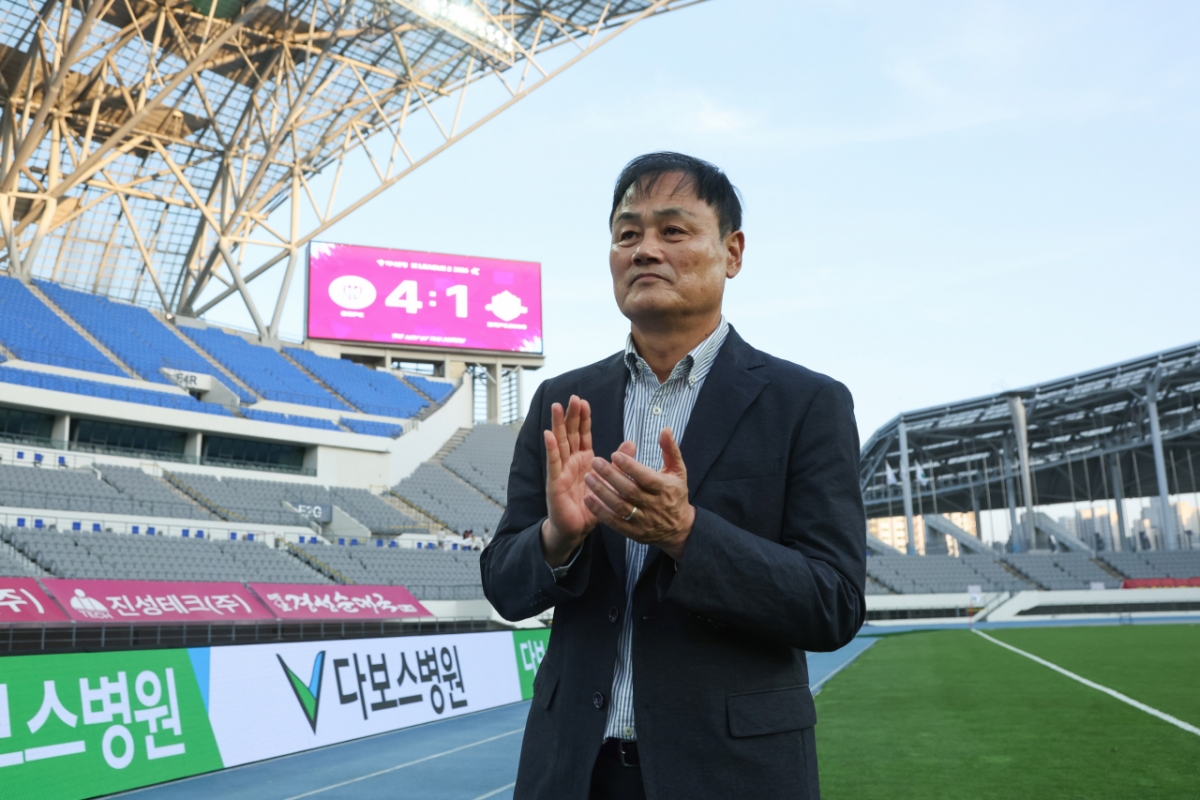 프로축구 K리그2 용인FC의 최윤겸 감독이 웃으며 말했다. 지난 26일 용인미르스타디움에서 열린 하나은행 K리그2 2026 9라운드 홈경기 김해FC전 4-1 승리 직후다. 이날 용인은 석현준의 멀티골 활약을 앞세워 김해를 꺾고 8경기 만에 감격적인 '창단 첫 승'을 거뒀다. 최 감독은 팀 승리를 이끈 석현준의 활약에 박수를 보내면서도 김민우를 '숨은 MVP'로 꼽았다. 취재진 질문에 답하는 과정이 아닌, 최윤겸 감독이 먼저 나서서 한 칭찬이었다.