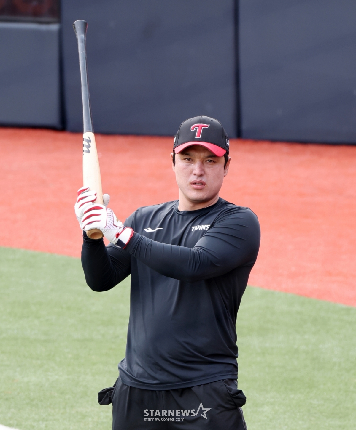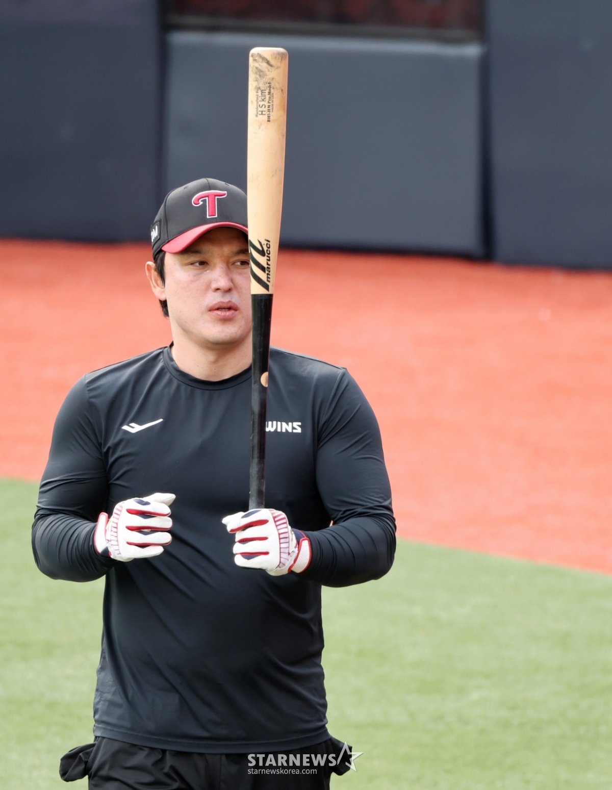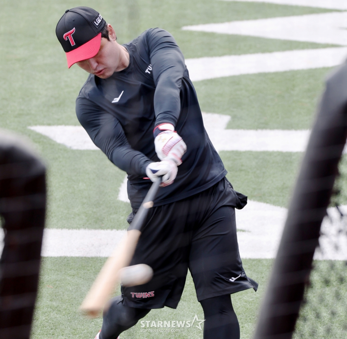 LG 포수 박동원이 28일 수원KT위즈파크에서 열린 2026KBO리그 LG트윈스와 KT위즈 경기에 앞서 방망이를 거꾸로 잡고 테니스볼을 치며 타격훈련을 하고 있다. 2026.04.28.