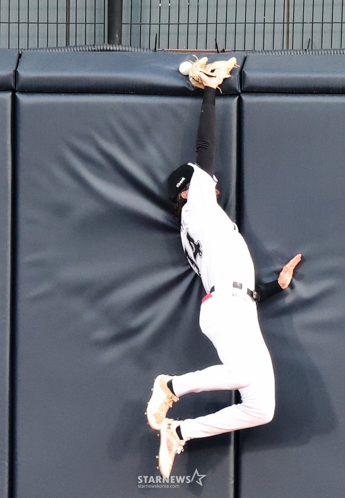KT 중견수 힐리어드가 28일 수원KT위즈파크에서 열린 2026KBO리그 LG트윈스와 KT위즈 경기 1회초 홍창기의 타구를 잡아내지못하고 있다. 홍창기의 3루타. 2026.04.28.