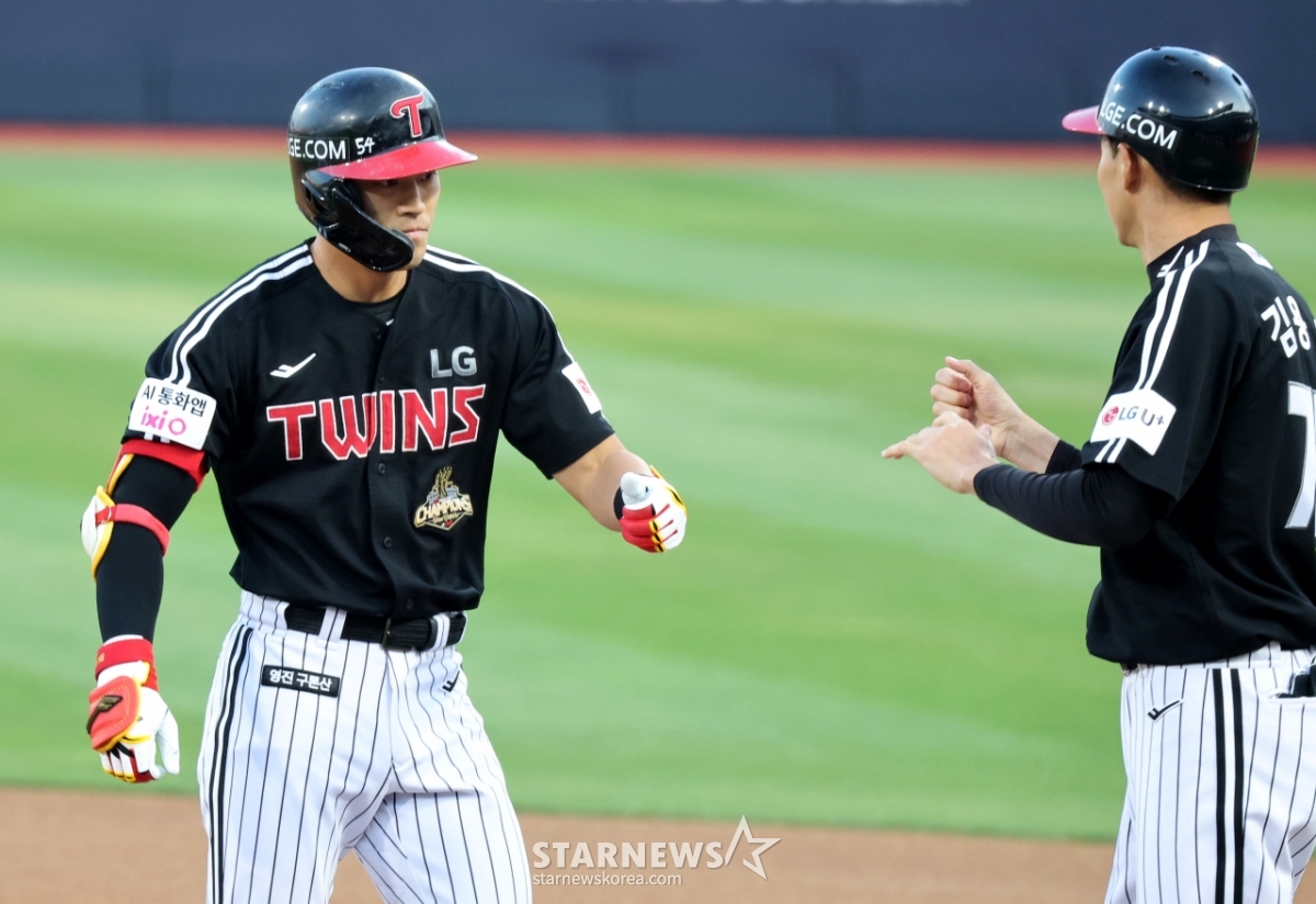 LG 2번타자 천성호가 28일 수원KT위즈파크에서 열린 2026KBO리그 LG트윈스와 KT위즈 경기 1회초 무사 3루에서 1타점 안타로 출루하고 있다. 2026.04.28.
