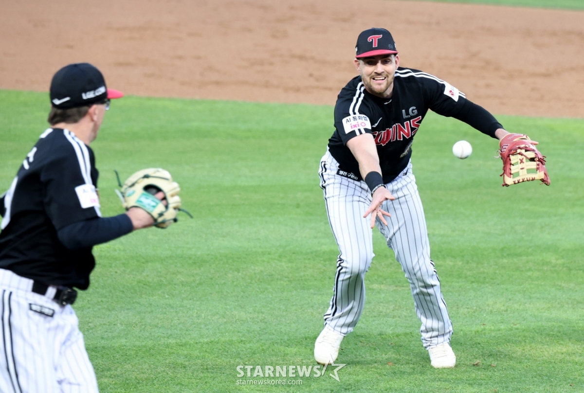 LG 좌완투수 웰스가 28일 수원KT위즈파크에서 열린 2026KBO리그 LG트윈스와 KT위즈 경기 1회말 오스틴의 토스된 볼을 잡기위해 1루로 향하고 있다. 타자주자 최원준은 세이프. 2026.04.28.